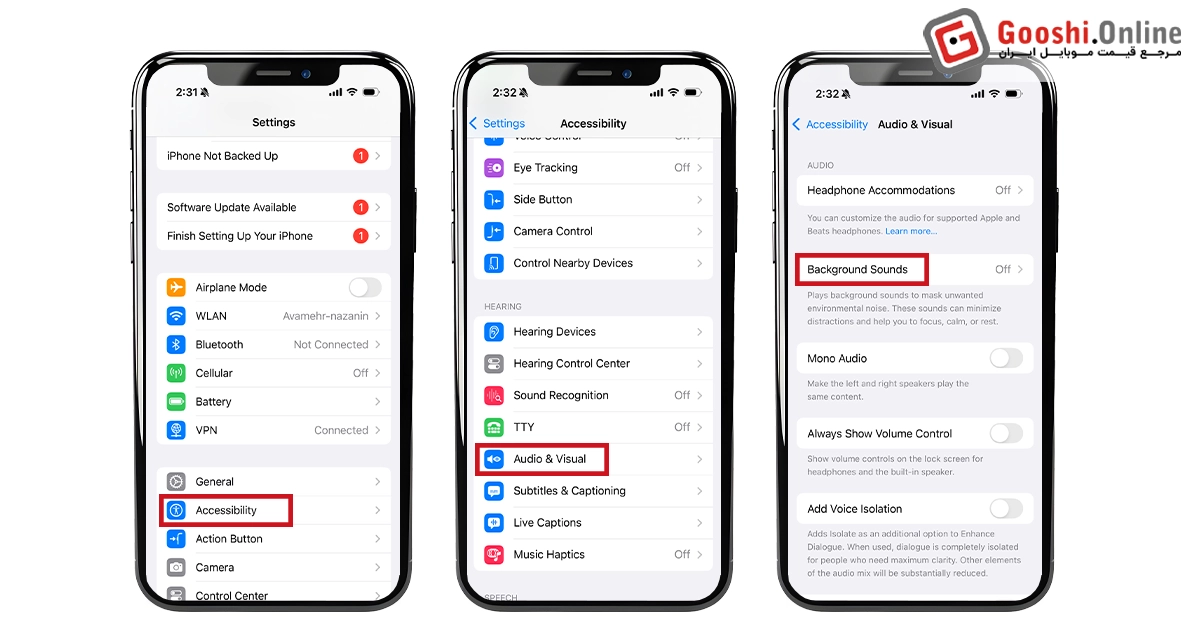 با مسیر زیر میتوانید صداهای آرامشبخش طبیعت مثل باران، دریا یا رودخانه را فعال کنید: