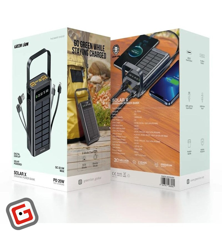 دارای 3 پورت خروجی 30 واتی : یک پورت تایپ سی و یک کابل متصل تایپ سی و یک پورت خروجی USB-A